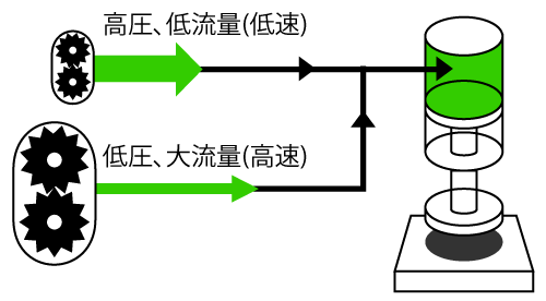 小容量と大容量の2連の固定容量ポンプと切換弁を用いて、合流/単独の切換を負荷圧力により自律制御。速度が必要な場合は大小ポンプを合流し高速回転することにより、大流量を吐出。保圧時は小容量ポンプ側のみを選択し、低速運転することにより大幅な省エネを実現。