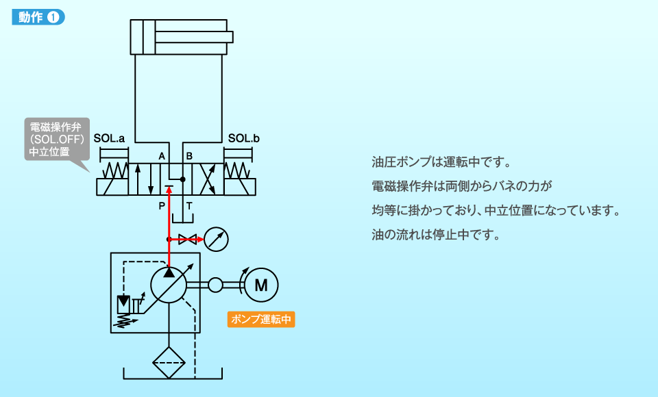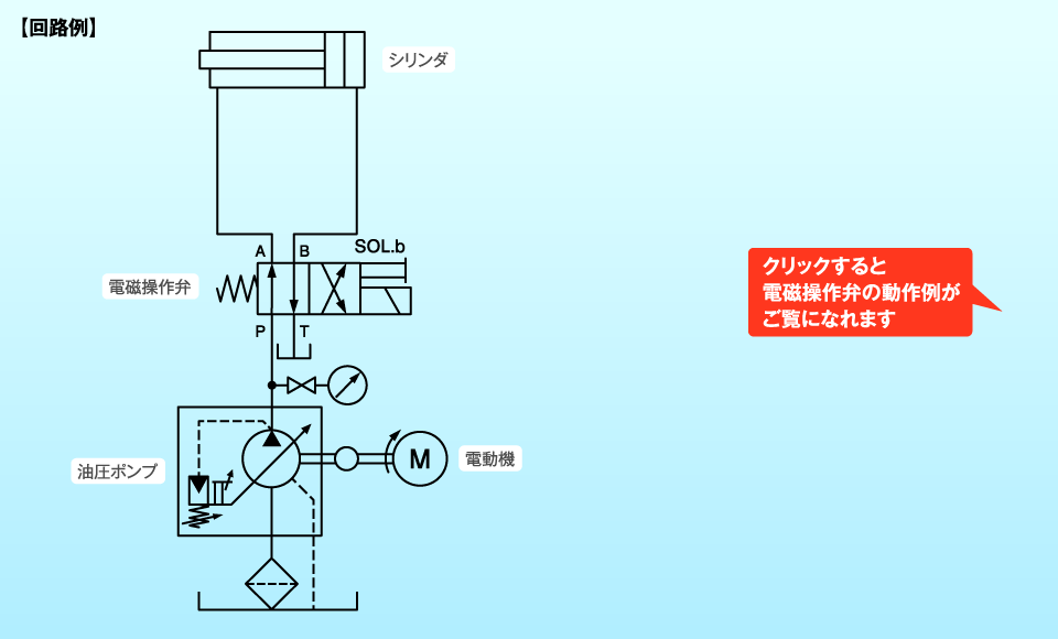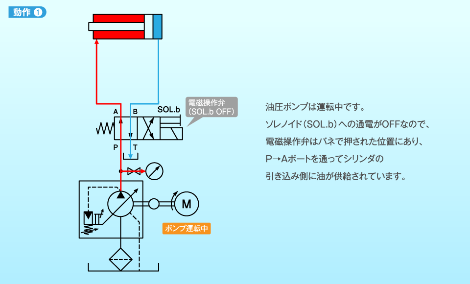 電磁操作弁(片ソレノイド形)の、油圧回路内での動作例について説明します。