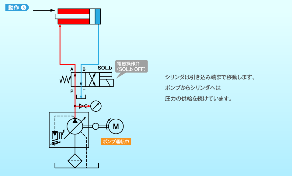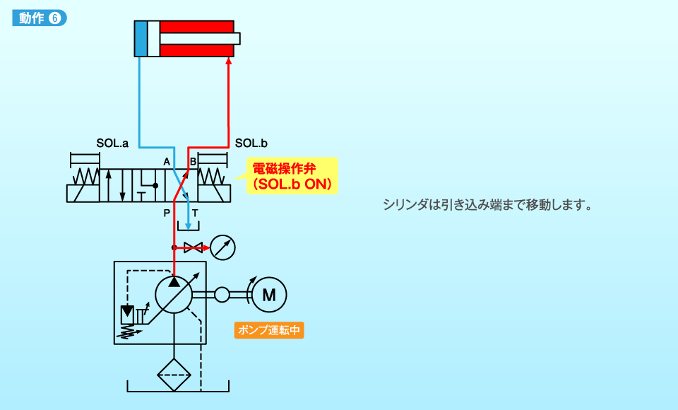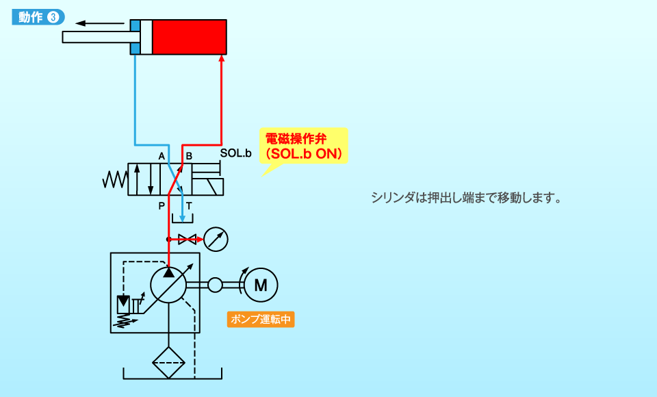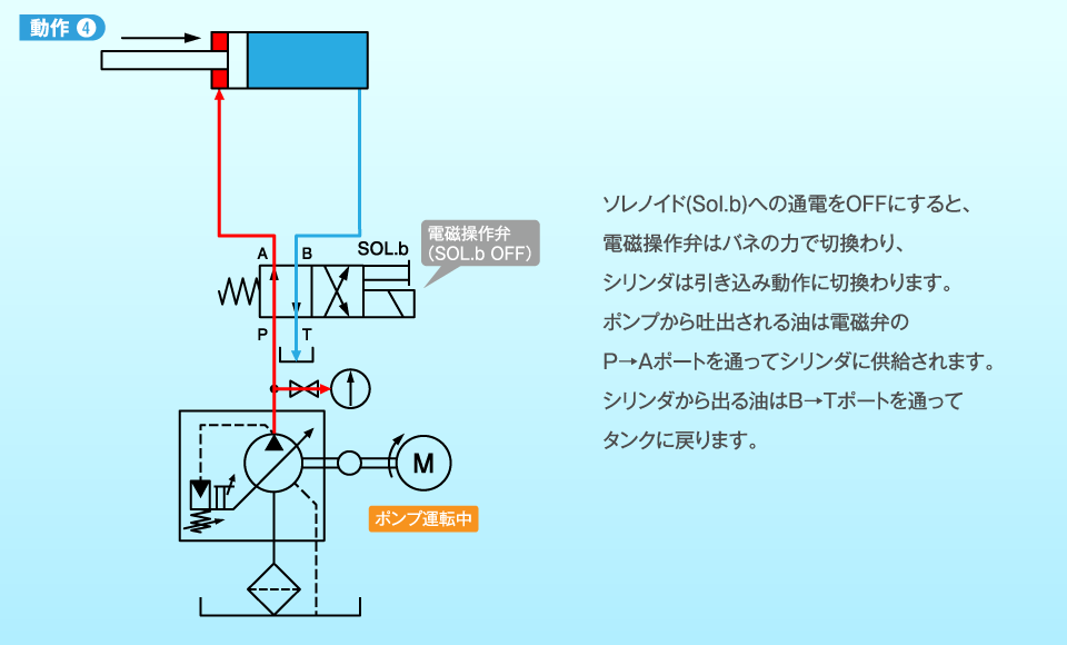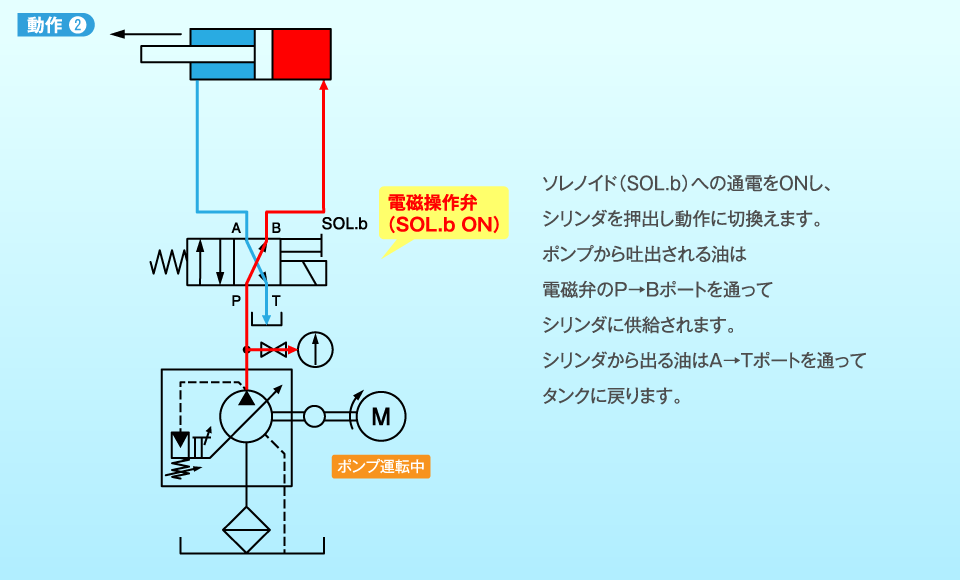 下記油圧回路図では、ソレノイド(SOL.b)への通電をON/OFFすることでシリンダの押出しと引き込み動作を切換えています。