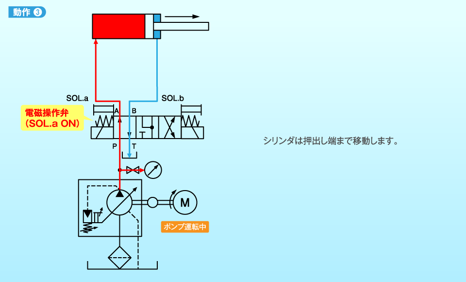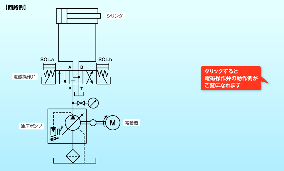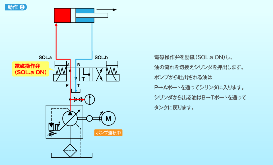 下記油圧回路図では、ソレノイド(SOL.a・SOL.b)の内、片方のソレノイドを通電ONすることでシリンダの押出しと引き込み動作を切換えています。