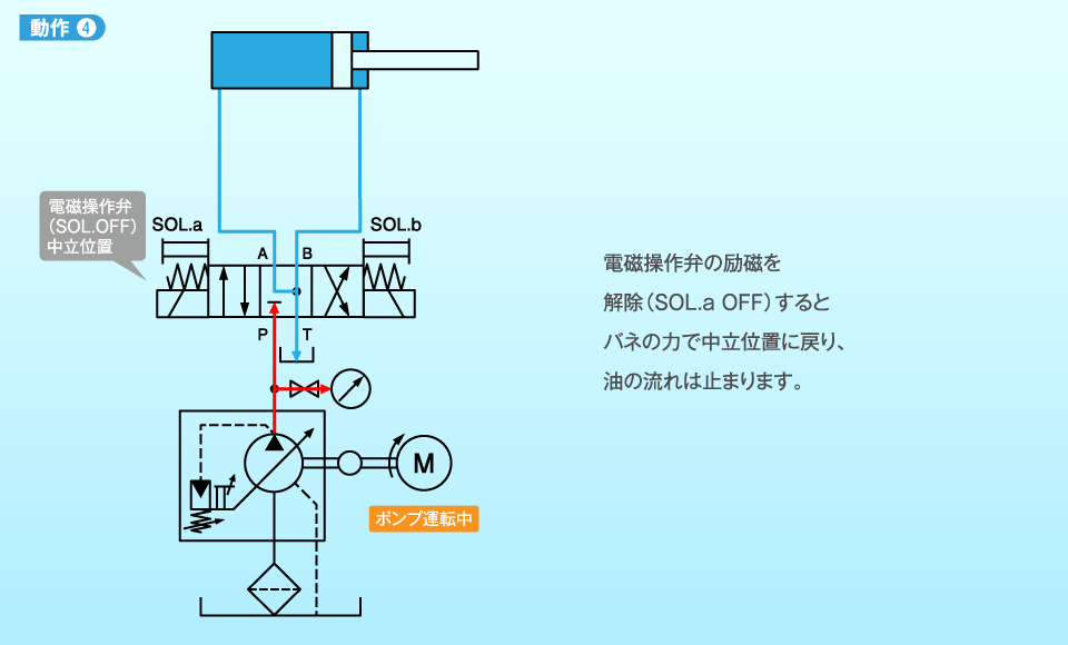 電磁操作弁(両ソレノイド形)の、油圧回路内での動作例について説明します。